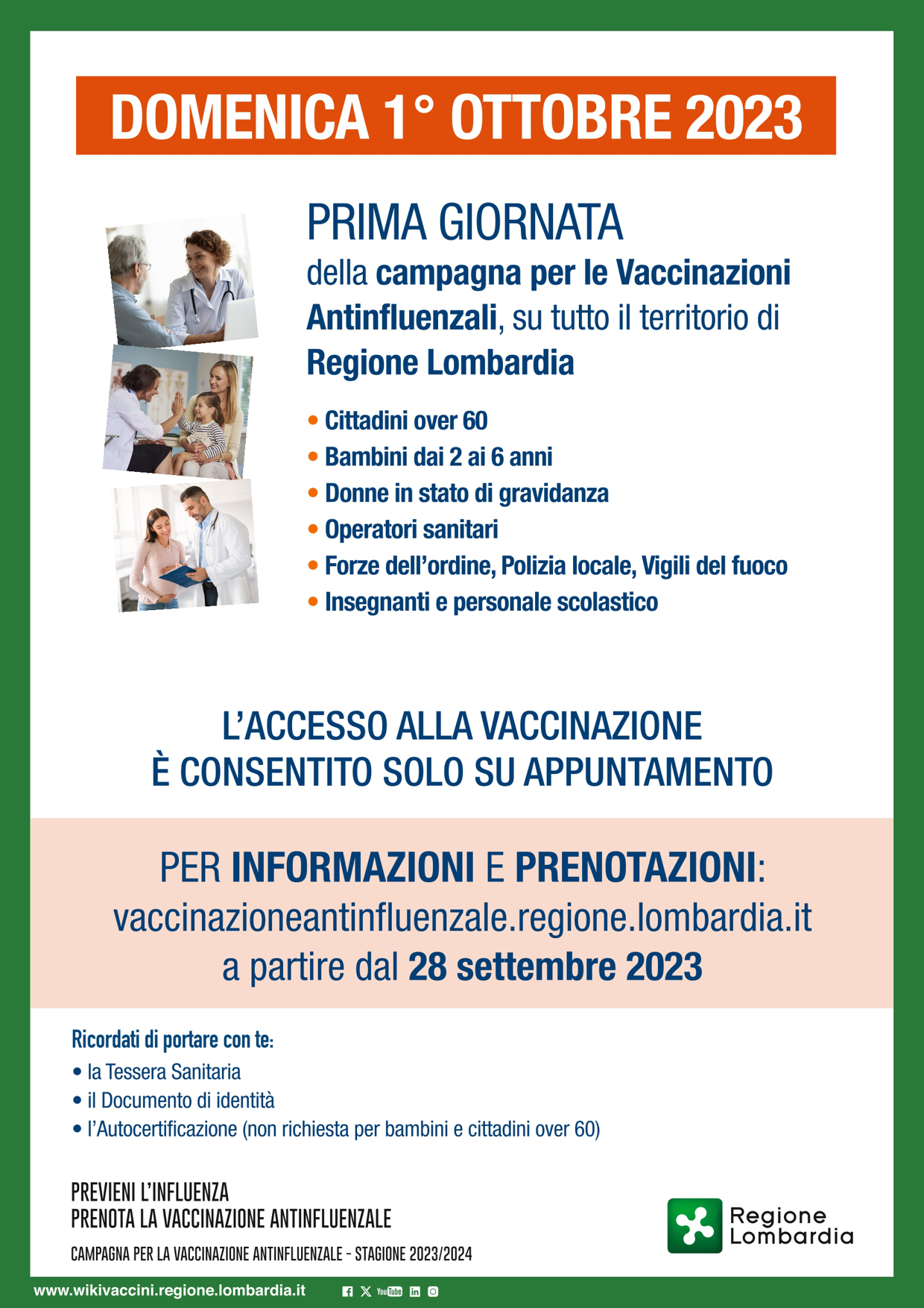Descrizione Domenica 1° Ottobre 2023 - Prima Giornata della Campagna per le Vaccinazioni Antinfluenzali, su Tutto il Territorio di Regione Lombardia Domenica 1° Ottobre 2023 Prima Giornata